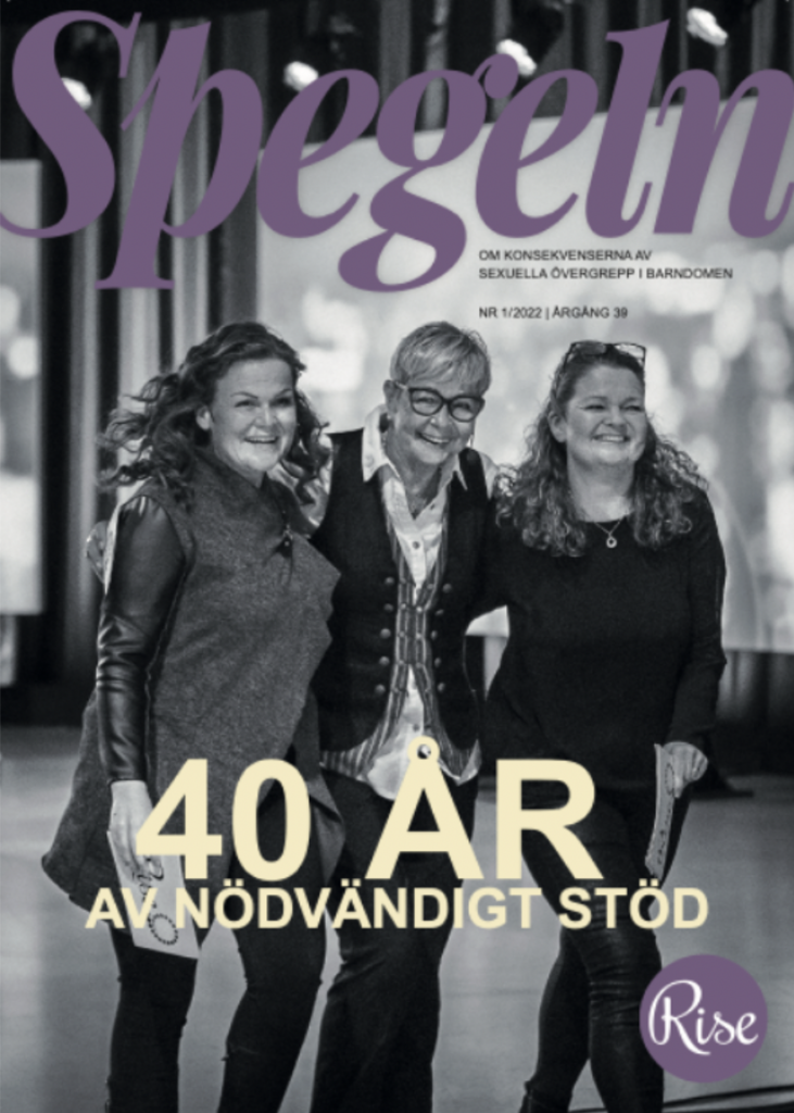 Rise tidning Spegeln har getts ut sedan 80-talet. I tidningen, som har ett särskilt tema varje nummer, skriver vi utifrån olika perspektiv på sexuella övergrepp i barndomen och dess konsekvenser. Vi informerar kring frågor som rör sexuella övergrepp i barndomen och dess långsiktiga konsekvenser. Vi speglar våra medlemmars verklighet utifrån olika perspektiv och inspirerar till fortsatt läkning och utveckling.